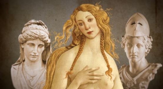 A deusa Afrodite entre as deusas Hera e Atena, em imagem da série "Grandes Mitos Gregos"